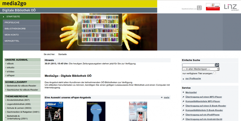 Für Oberösterreicher, die bei einer der teilnehmenden Bibliotheken einen Leserausweis besitzen, ist es jetzt möglich eine große Anzahl von e-books kostenlos für eine begrenzte Zeit online auszuleihen. Möglich macht das Media2go - Digitale Bibliothek OÖ, das vom Land Oberösterreich, der Stadt Linz und der Linzer Stadtbibliothek finanziert wird.