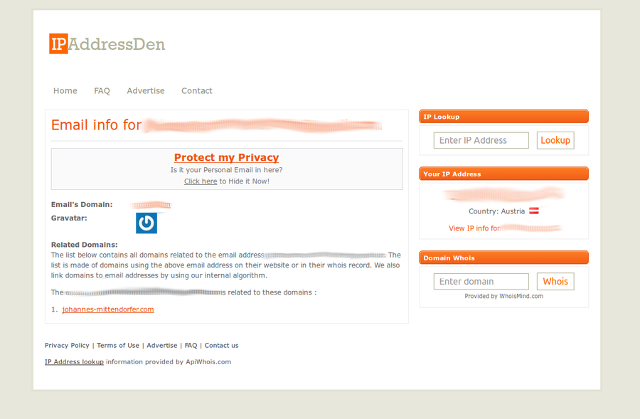 Auf ein sehr fragwürdiges Geschäftsmodell bin ich heute gestoßen: Es gibt doch tatsächlich eine Website, die die verpflichtend eingetragenen Email-Adressen für Domains aufsammelt und auf ihrer Website ungeschützt anzeigt. Das sieht dann so aus: