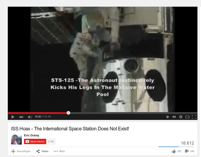 In einem einstündigen (!) Video erklärt jemand, wieso die Internationale Raumstation nicht existiert und sowieso die gesammte Weltraumaktivität des Menschen Fake ist. Alle Aufnahmen sind angeblich von der NASA bei Hyperbelflügen produziert und durch Greenscreen-Technik mit einem Hintergrund versehen worden.
